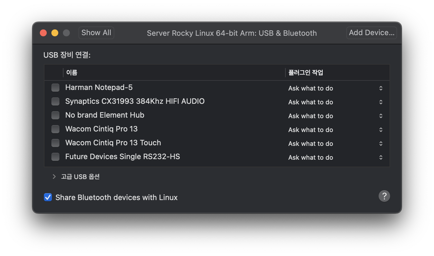 usb 장치도 이와 같이 vmware - server 이미지 우클릭 - setting - usb&bluetooth - 필요한 장치 체크