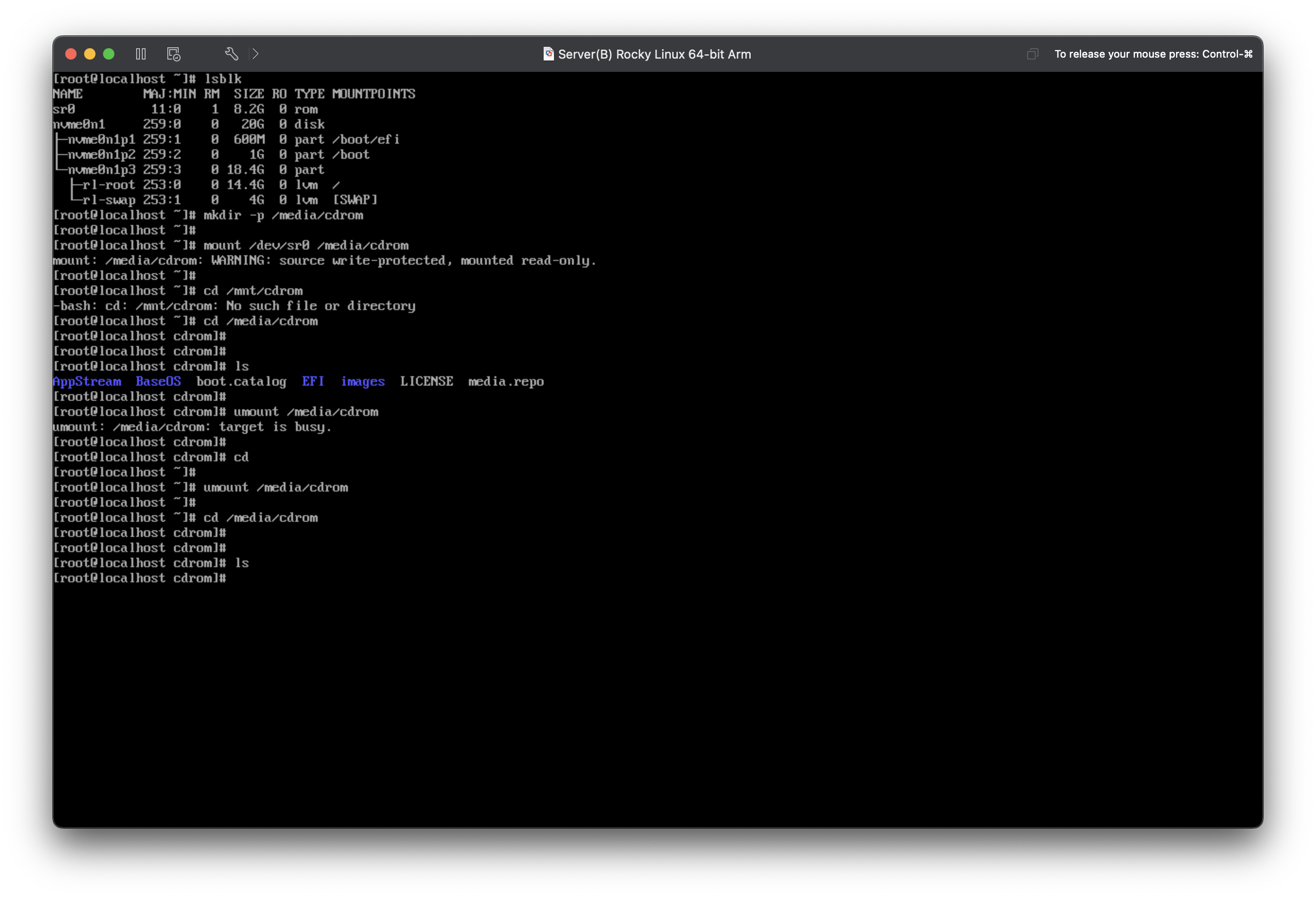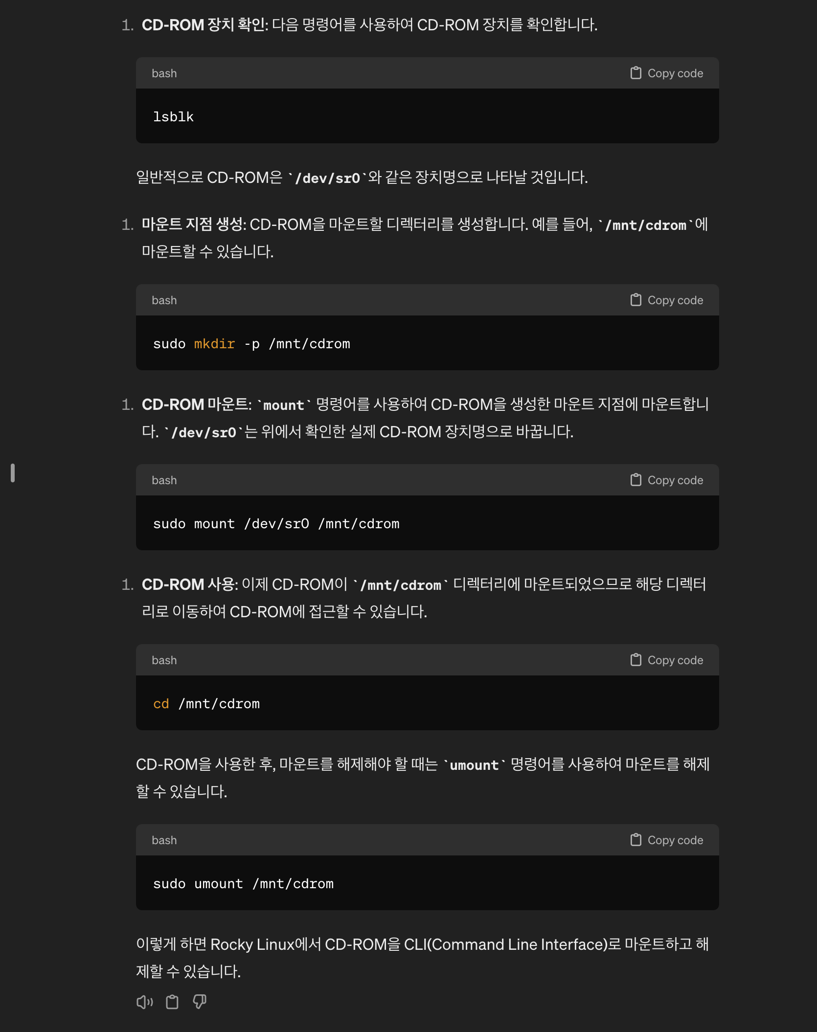 시디롬 폴더에서 명령을 입력하면 폴더가 사용중이기 때문에 마운트 해제에 실패한다. 주의할것.