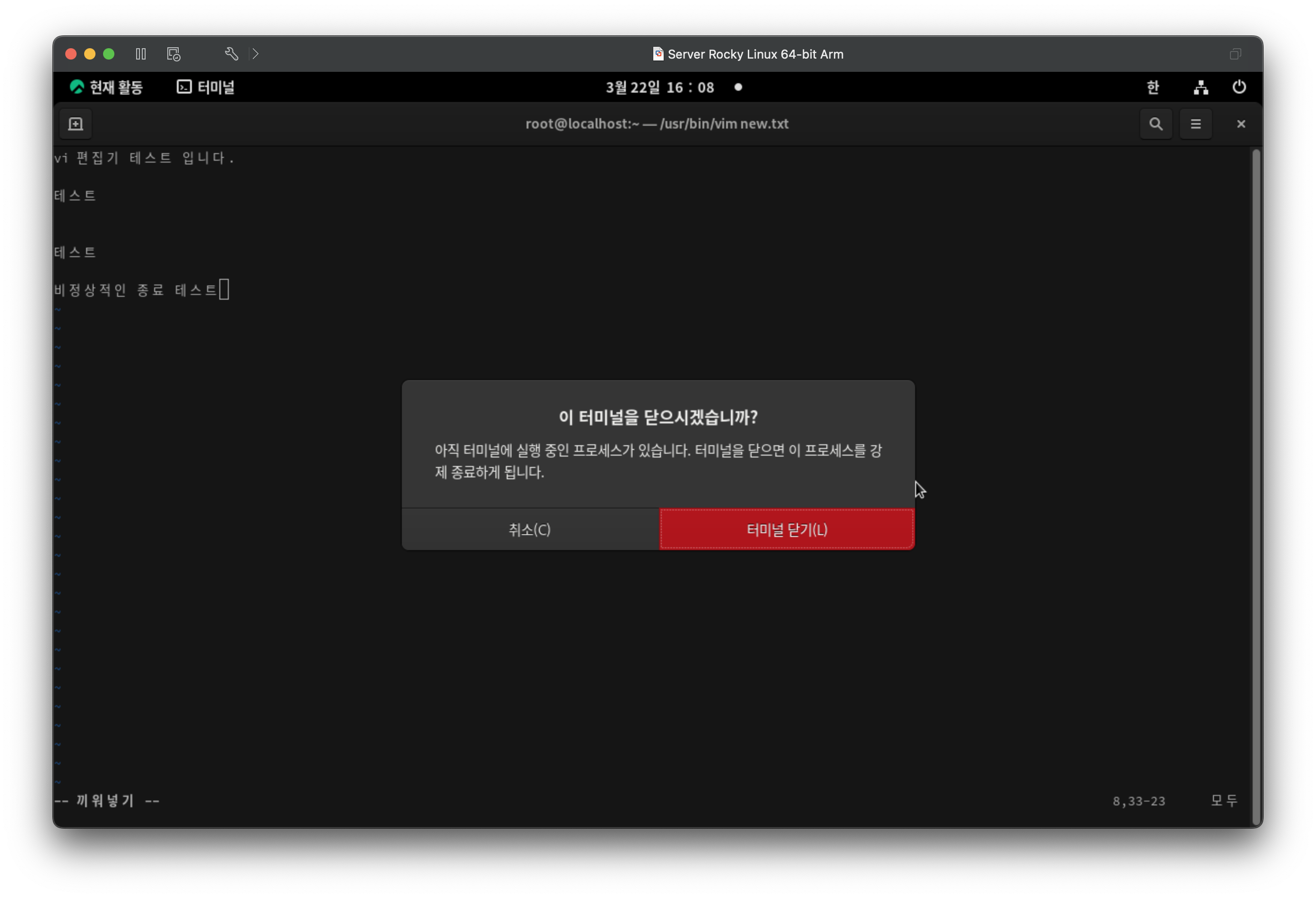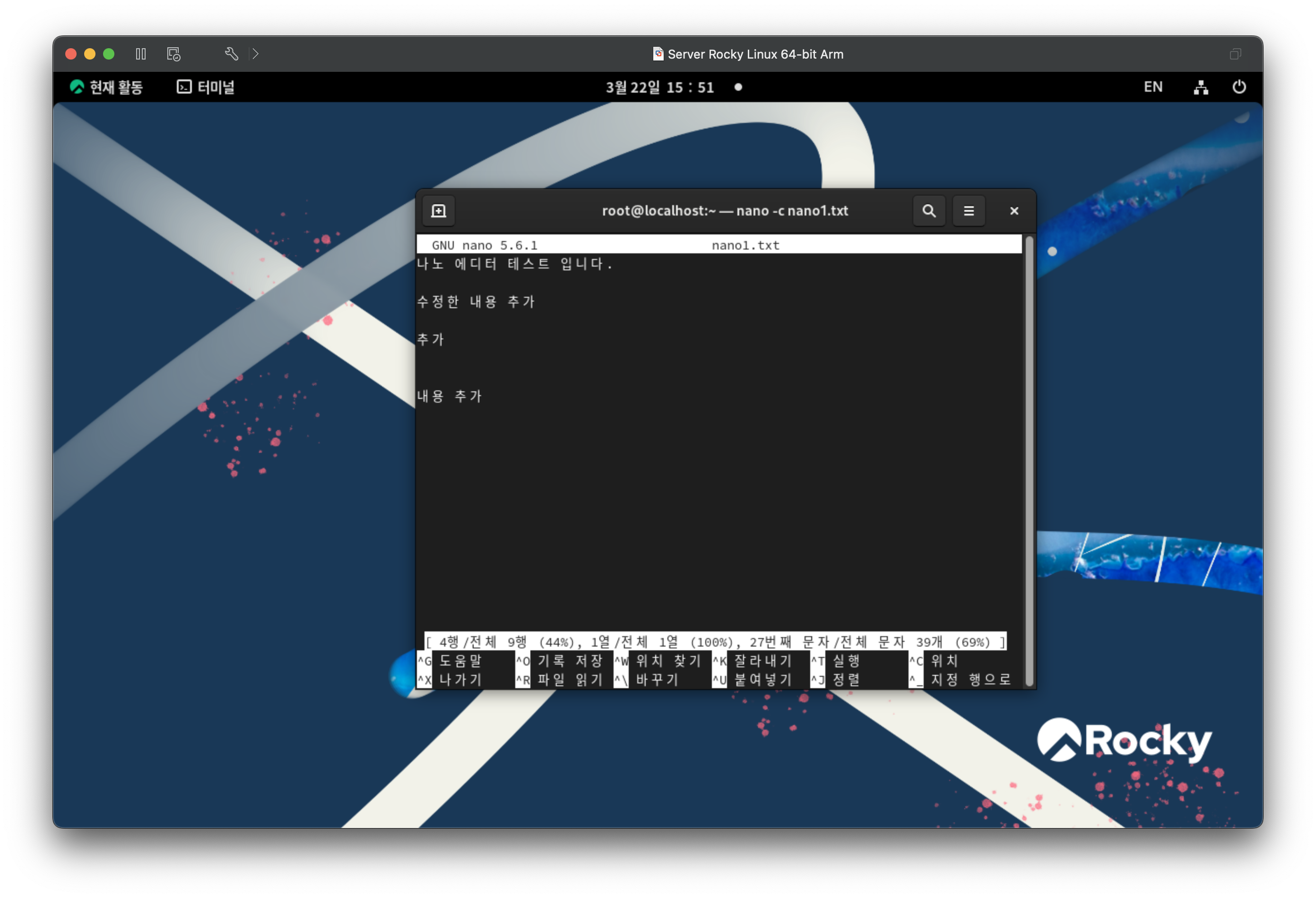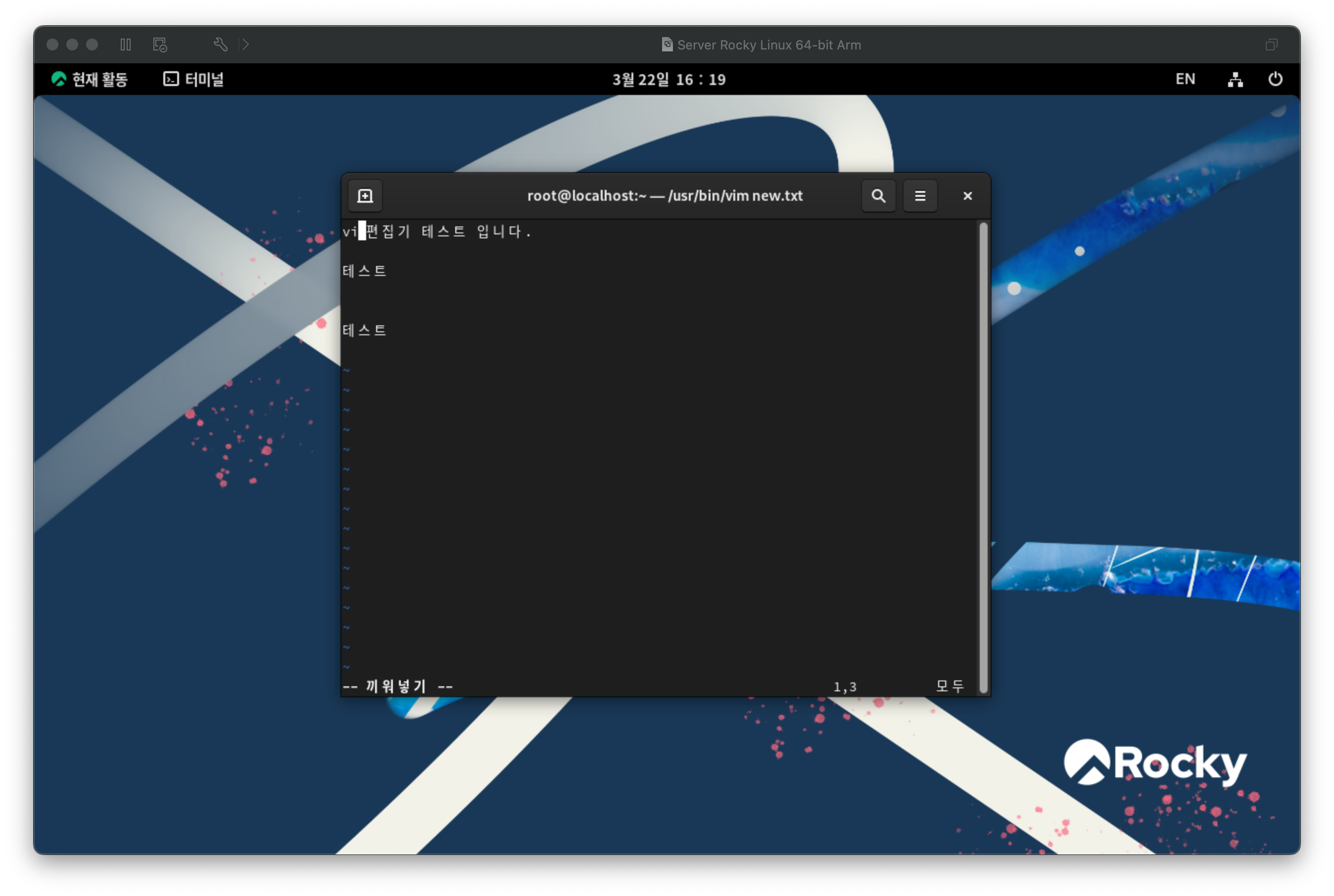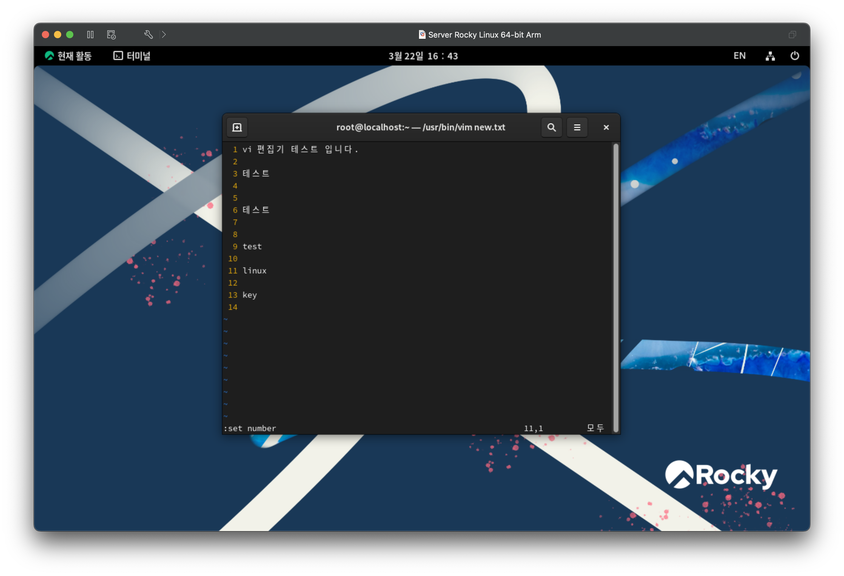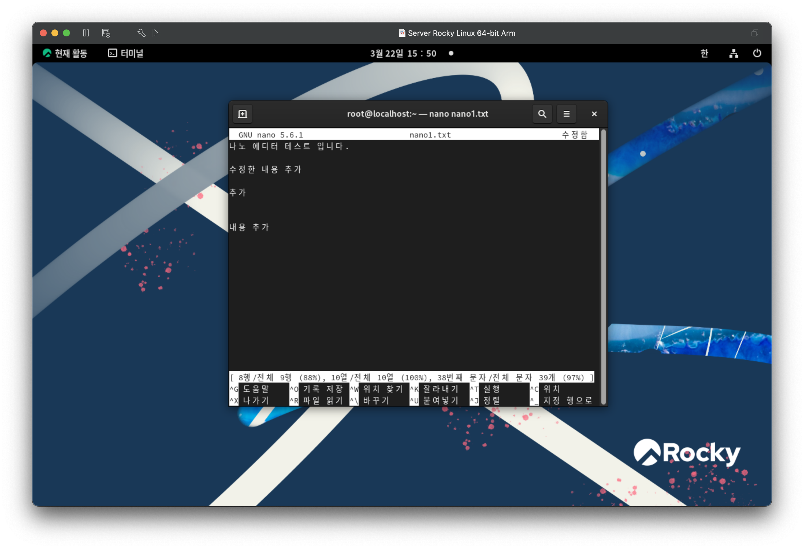텍스트를 입력하고 test1 으로 홈폴더에 저장하고 종료한다.
