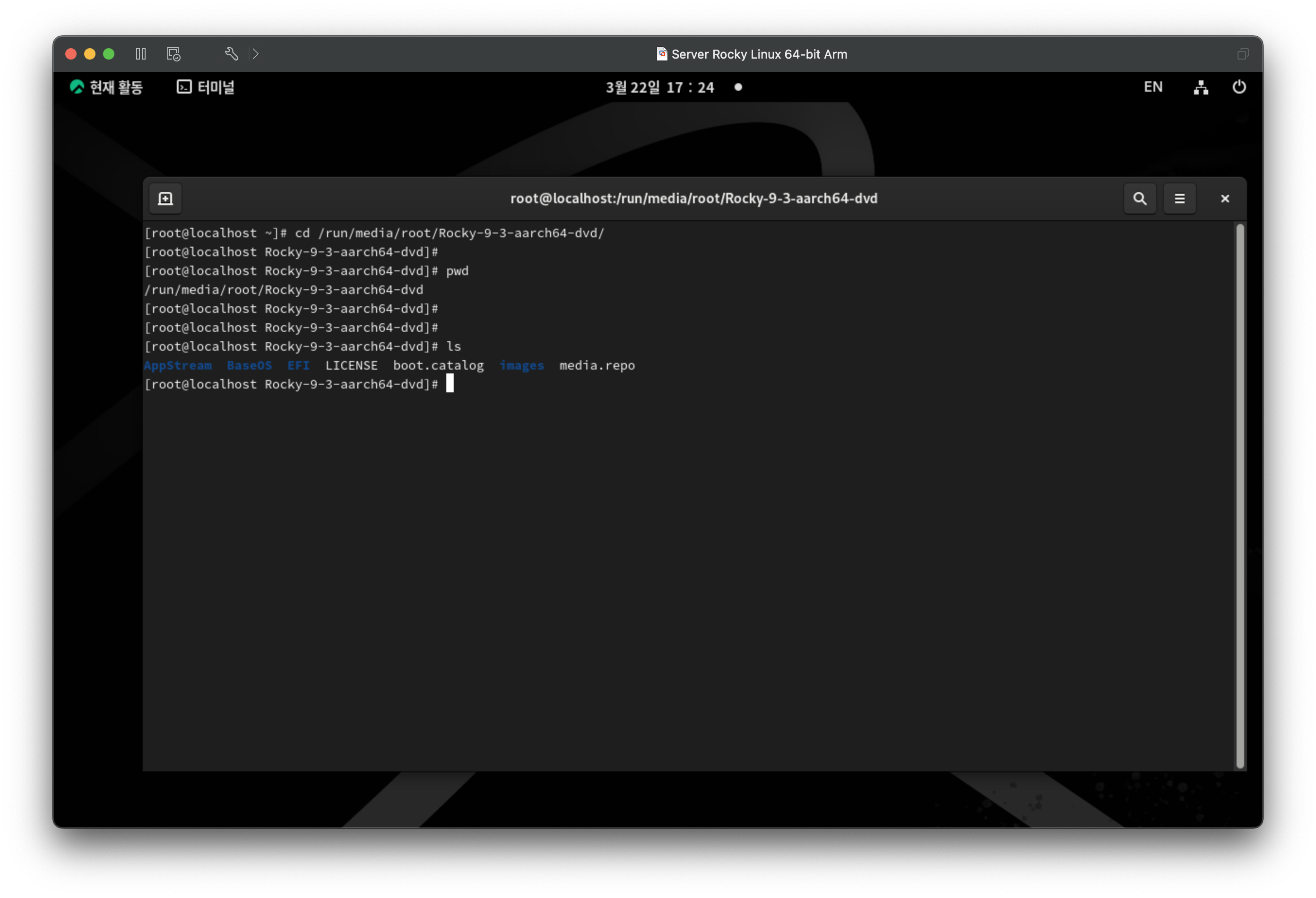 마운트 된 시디롬 위치로 이동한다. 디렉토리명이 길기 때문에 자동완성을 사용한다.