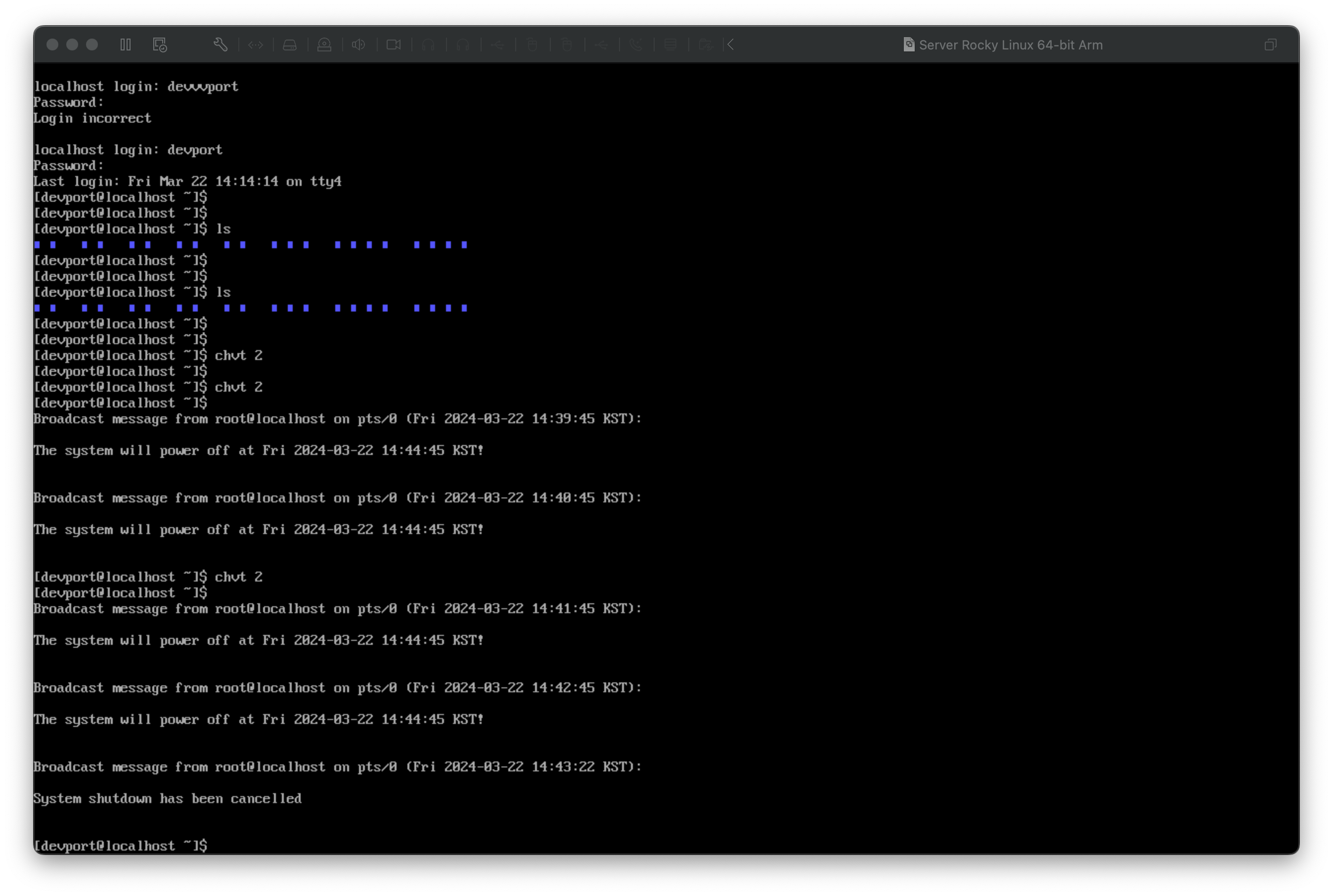 10분 뒤에 종료 - 22시에 재부팅(-r 옵션) - 예약된 shoutdown 명령 취소 - 접속한 사용자에게 15분 뒤에 종료된다는 메시지 전송 (실제로 종료하지 않는다.)