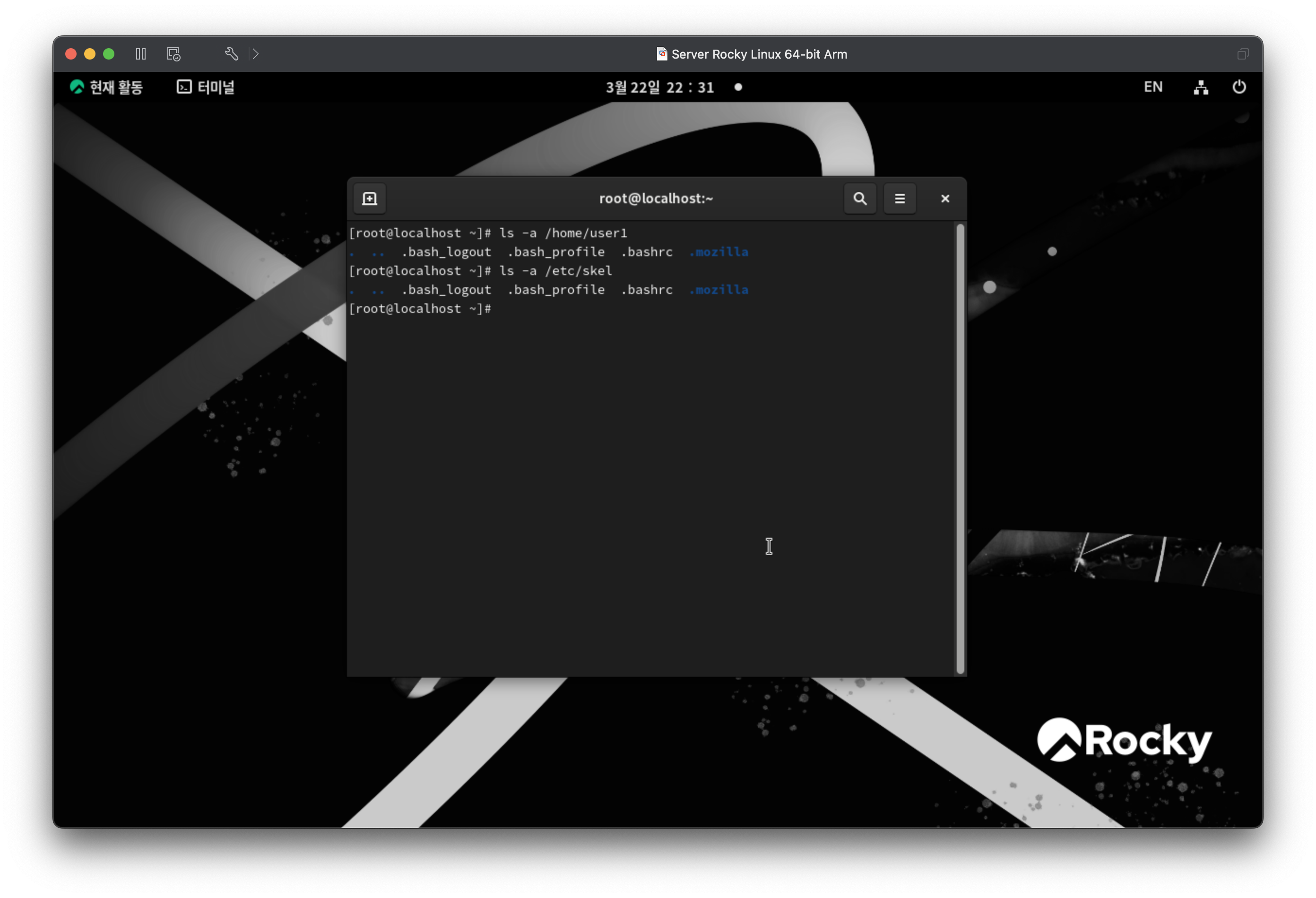 유저1의 디렉토리와 skel의 디렉토리가 동일하다. skel 디렉토리의 파일을 유저가 생성되면 그 홈디렉토리로 복사한다.