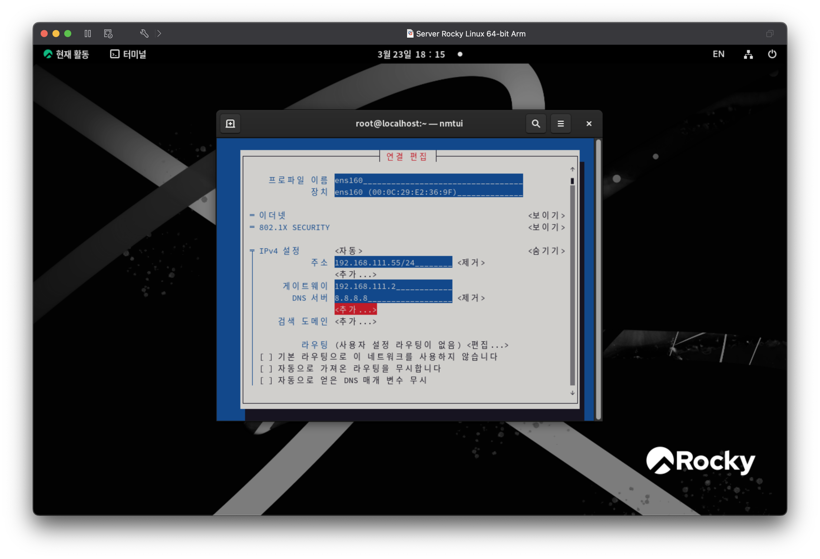 rocky linux9는 랜카드의 이름을 ens160으로 인식한다. vmware 버전에 따라 달라질수 있다.