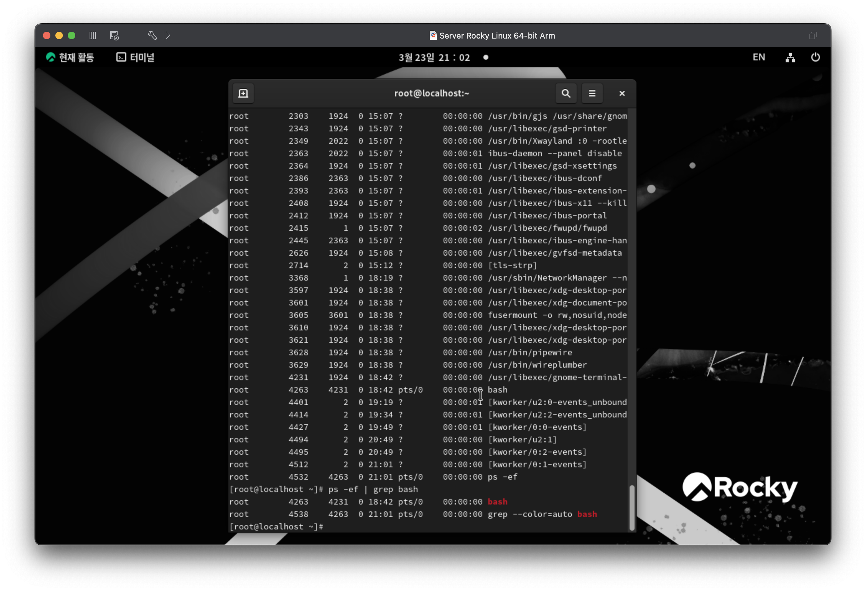 ps -ef 는 위와 같이 모든 프로세스 번호가 출력되지만 | grep bash 필터를 걸면 두개만 표시된다.
