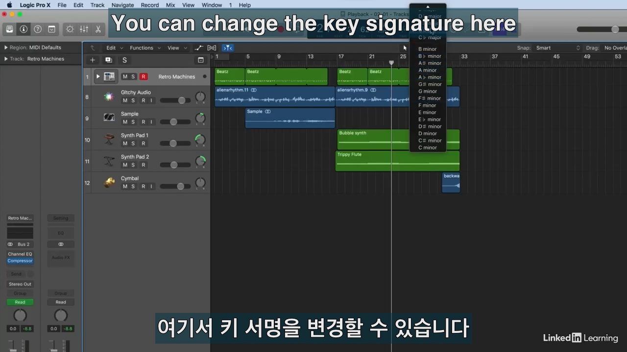 프로젝트 키는 중심 음(토닉이라고 함)을 정의하고 프로젝트가 장조 또는 단조 음계를 사용하는지 여부를 정의합니다. 키를 변경하면 프로젝트에서 Apple Loops 재생과 악보 편집기의 MIDI 노트 표시에 영향을 미칩니다.