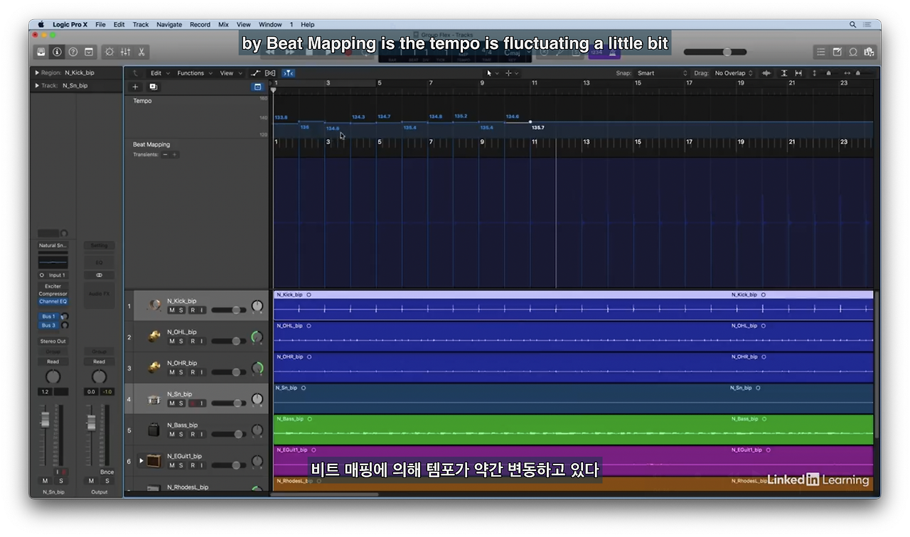 해당 드럼 리전의 편집기를 열고 스마트 템포 탭에서 연주 템포를 확인한다(133.9)