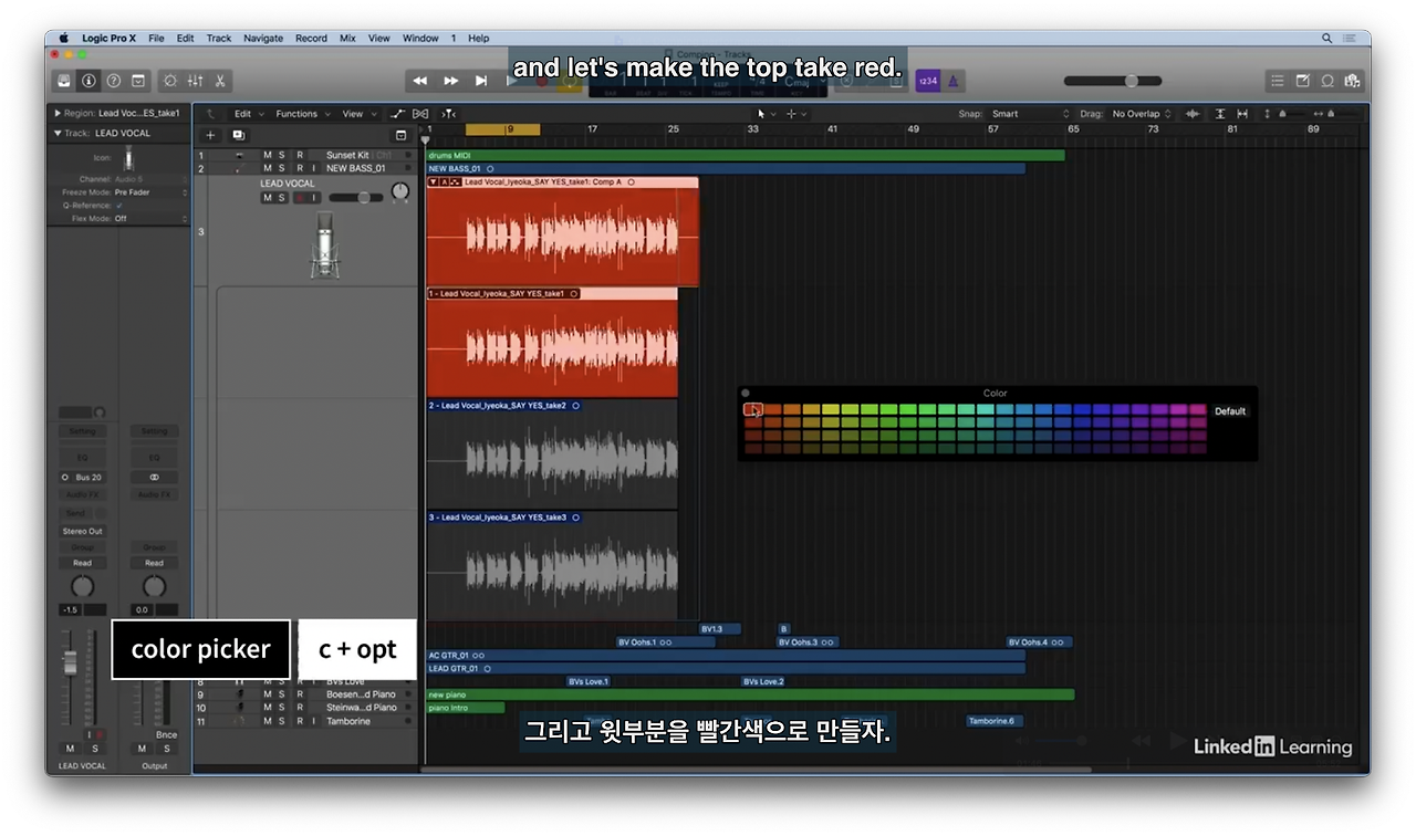 테이크 별로 드래그한다. 색을 달리 함으로써 어떤 테이크의 일부가 포함되었는지 트랙에서 쉽게 확인할 수 있다.