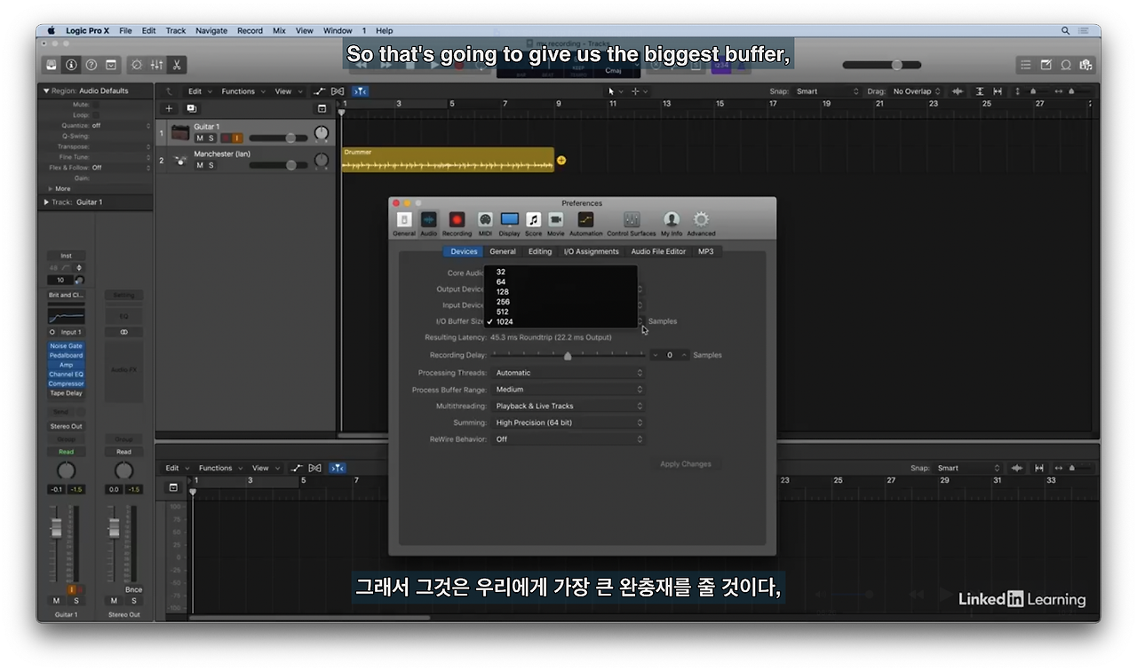 오디오 레코딩 중에는 128로 설정하여 레이턴시를 줄이고 그 외 작업을 할 때는 1024 사이즈를 이용한다.