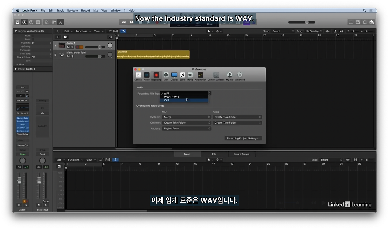 로직 환경설정에서 파일 타입을 설정한다. wav가 업계표준이다.