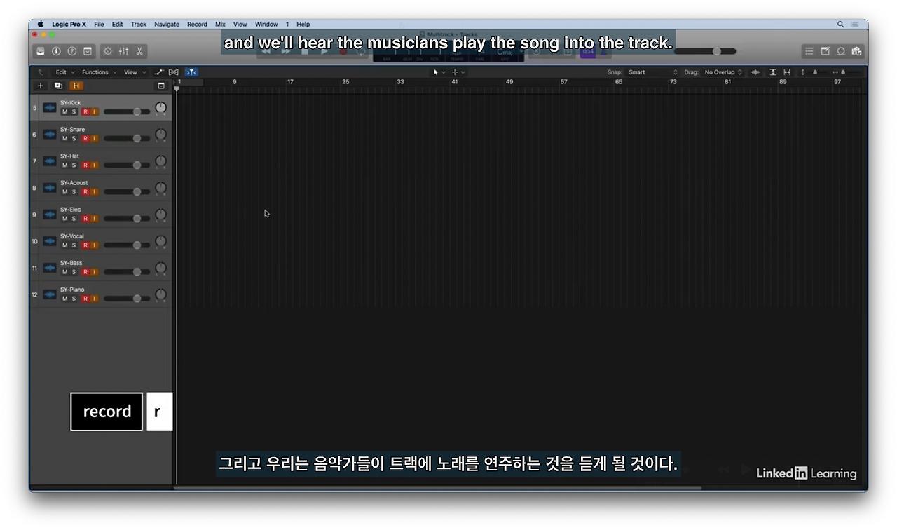 r 버튼 체크로 녹음 활성화한다. 그다음 R로 녹음 시작(녹음 활성화 되지 않은 트랙은 녹음되지 않는다)