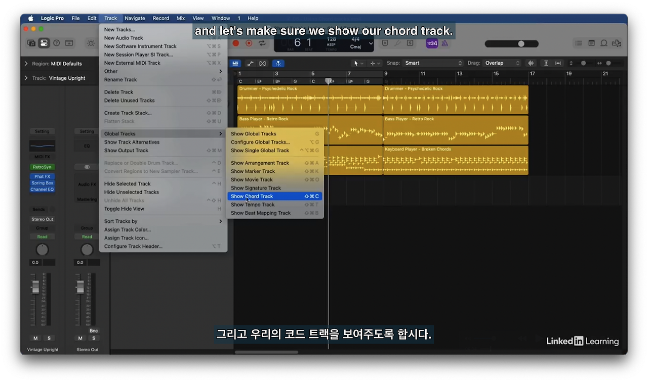현재 눈금자 영역에 코드가 표시된다. 글로벌 트랙 버튼을 통해서 코드트랙을 연다.
